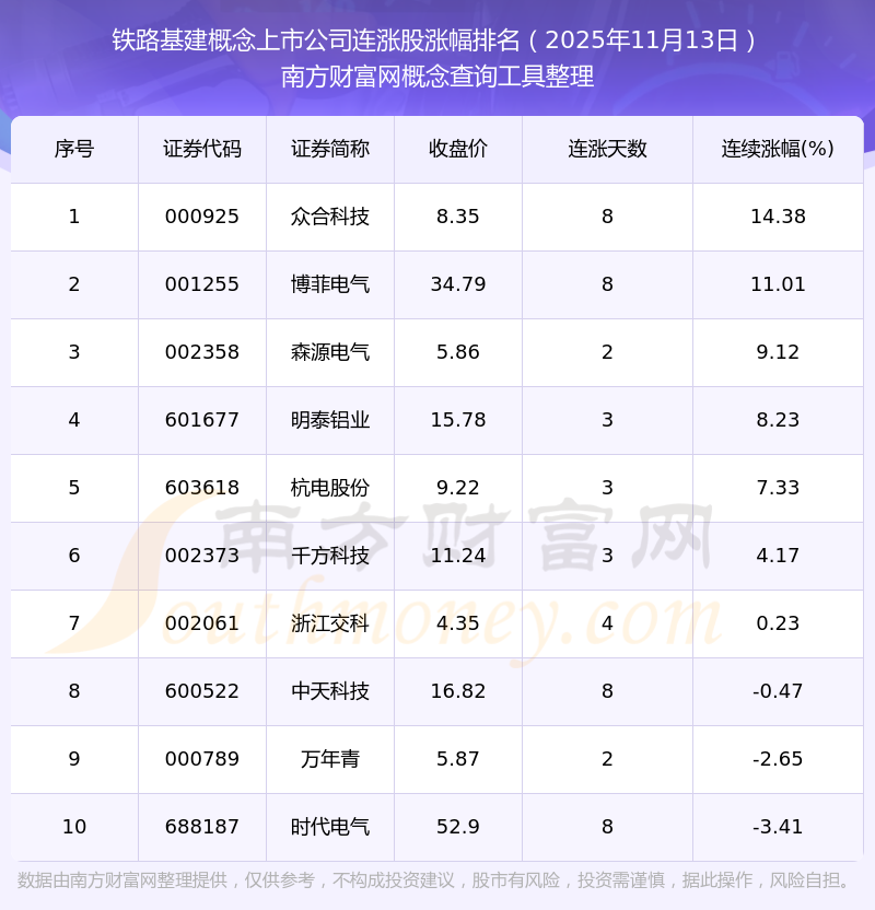 2025年11月13日鐵路基建概念上市公司連漲股漲幅排名