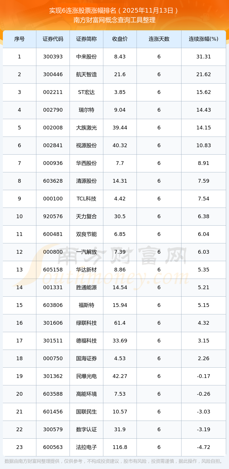 根據(jù)南方財富網(wǎng)概念查詢工具數(shù)據(jù)統(tǒng)計,截止2025年11月13日收盤,共有23只個股實現(xiàn)6天連漲。其中連續(xù)漲幅較大的個股有中來股份、航天智造、ST宏達等,連續(xù)漲幅分別為31.31%、21.62%、15.62%。