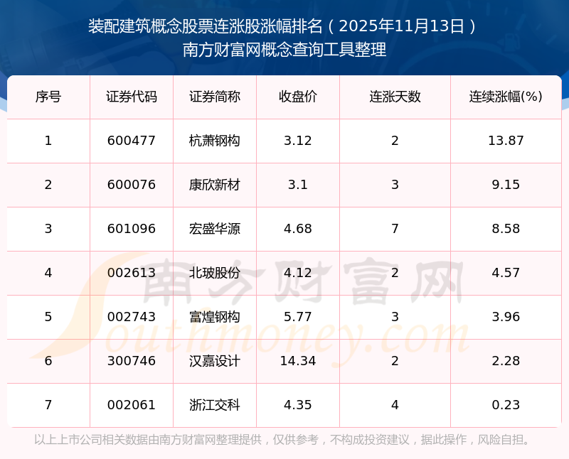 根據(jù)南方財(cái)富網(wǎng)概念查詢工具數(shù)據(jù)統(tǒng)計(jì),截止2025年11月13日收盤,裝配建筑概念股票共有7只個(gè)股實(shí)現(xiàn)連漲。其中連續(xù)漲幅較大的個(gè)股有杭蕭鋼構(gòu)、康欣新材、宏盛華源等,連續(xù)漲幅分別為13.87%、9.15%、8.58%。