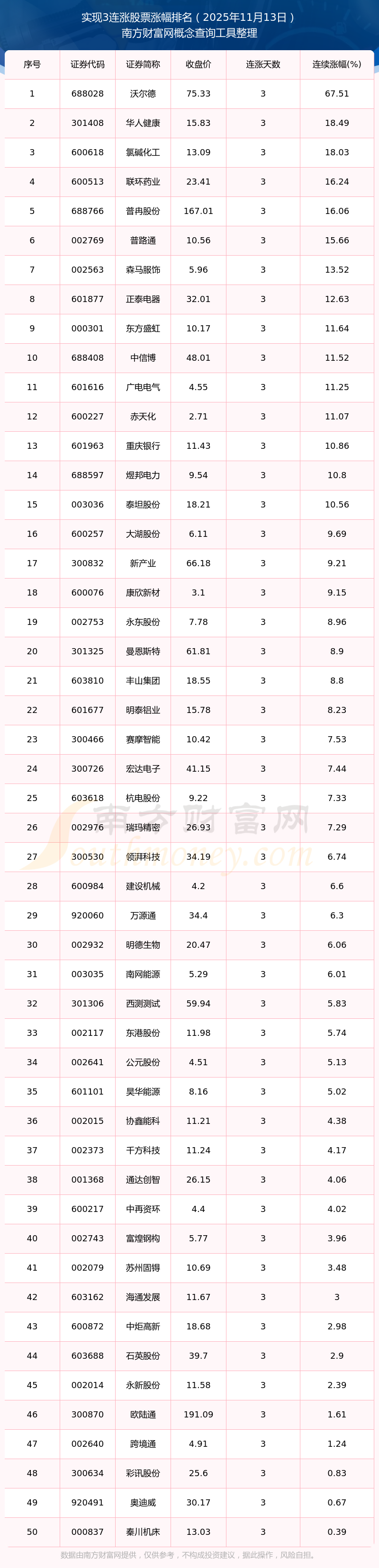 根據(jù)南方財富網(wǎng)概念查詢工具數(shù)據(jù)統(tǒng)計,截止2025年11月13日收盤,共有69只個股實現(xiàn)3天連漲。其中連續(xù)漲幅較大的個股有沃爾德、華人健康、氯堿化工等,連續(xù)漲幅分別為67.51%、18.49%、18.03%。