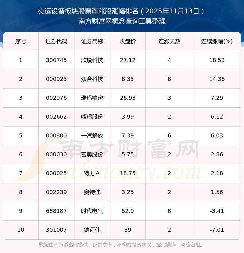 根據(jù)南方財富網(wǎng)概念查詢工具數(shù)據(jù)統(tǒng)計,截止2025年11月13日收盤,交運設備板塊股票共有10只個股實現(xiàn)連漲。其中連續(xù)漲幅較大的個股有欣銳科技、眾合科技、瑞瑪精密等,連續(xù)漲幅分別為18.53%、14.38%、7.29%。