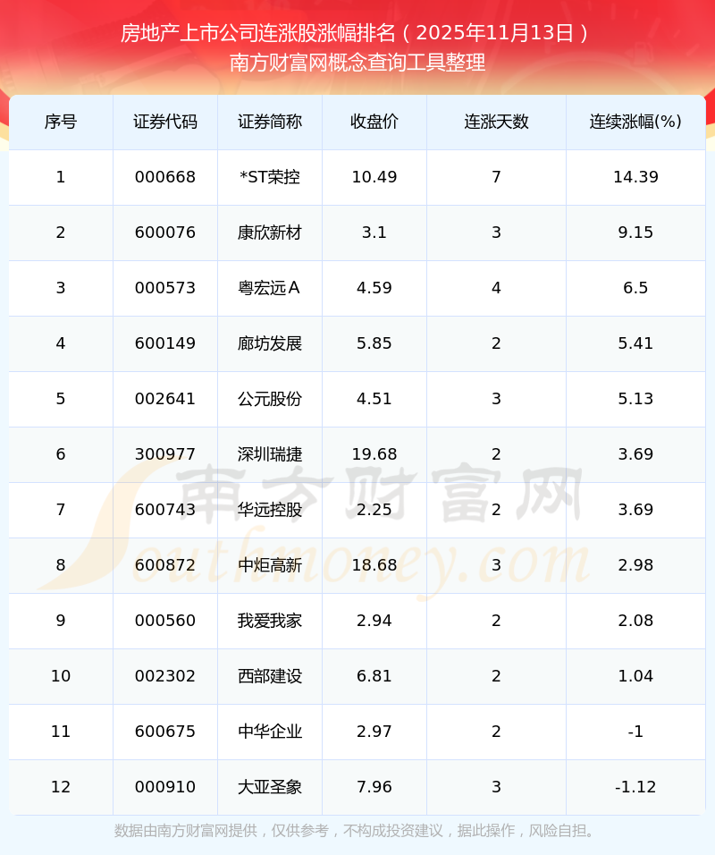 2025年11月13日房地產(chǎn)上市公司連漲股漲幅排名