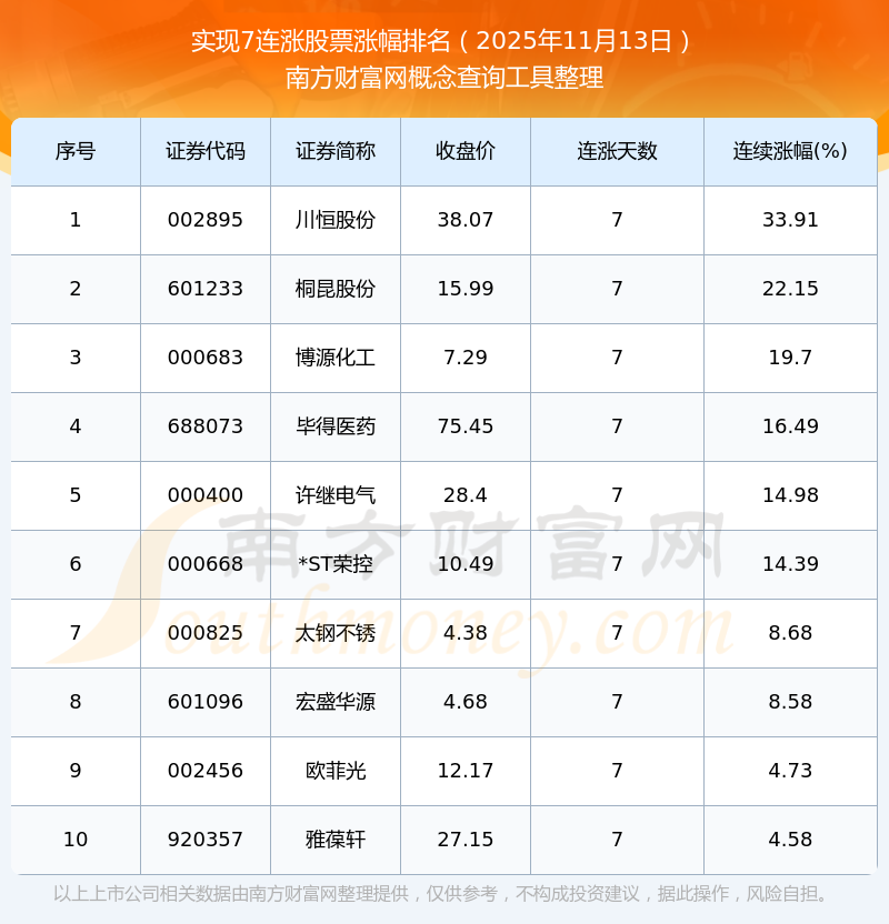 2025年11月13日實現(xiàn)7連漲股票漲幅排名