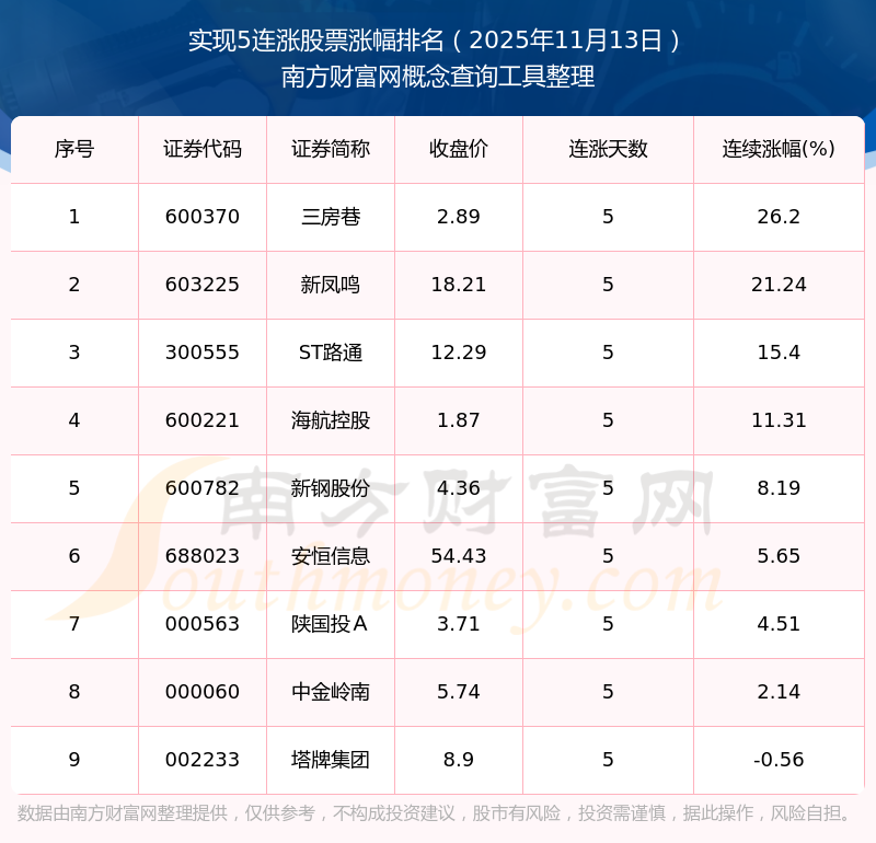 根據(jù)南方財富網(wǎng)概念查詢工具數(shù)據(jù)統(tǒng)計,截止2025年11月13日收盤,共有9只個股實現(xiàn)5天連漲。其中連續(xù)漲幅較大的個股有三房巷、新鳳鳴、ST路通等,連續(xù)漲幅分別為26.20%、21.24%、15.40%。