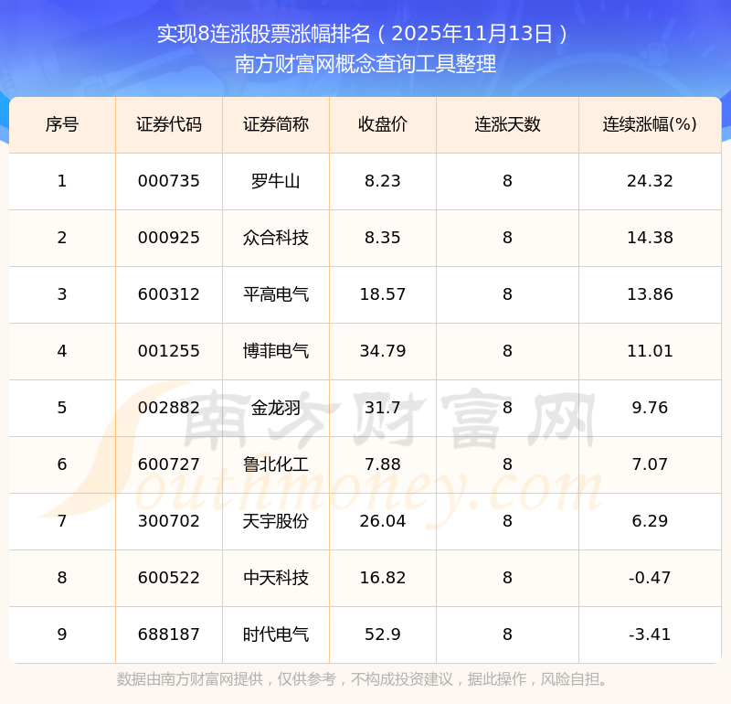 2025年11月13日實現(xiàn)8連漲股票漲幅排名