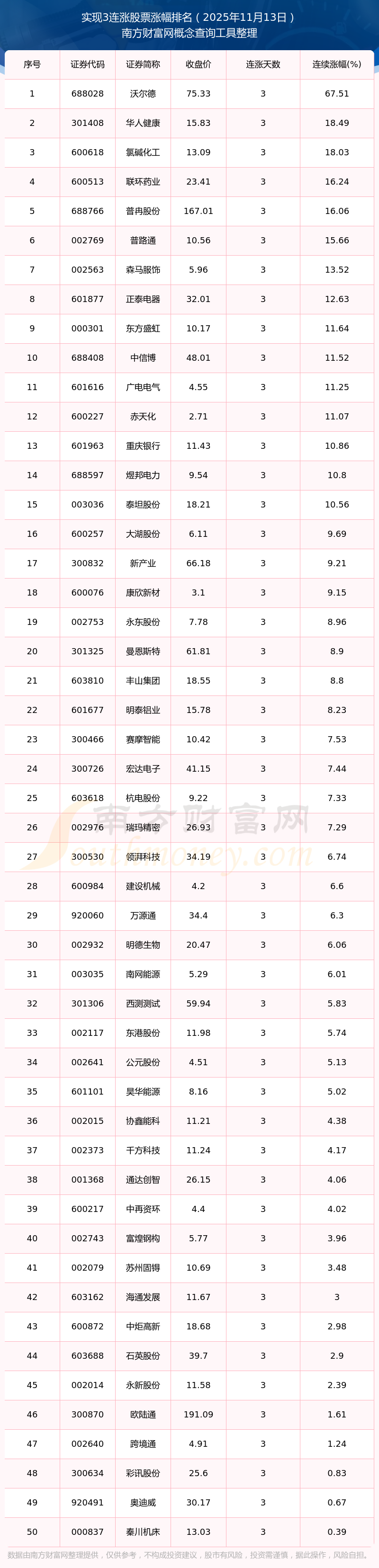 2025年11月13日實現(xiàn)3連漲股票漲幅排名