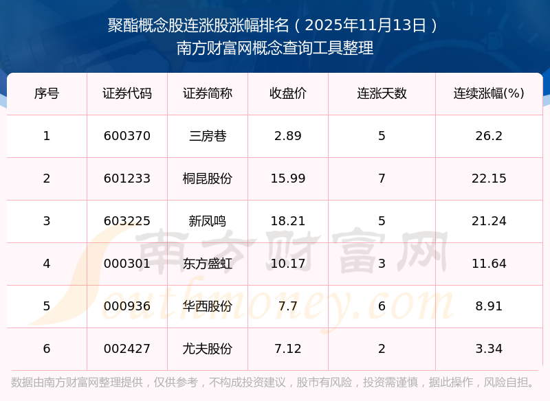 根據(jù)南方財富網(wǎng)概念查詢工具數(shù)據(jù)統(tǒng)計,截止2025年11月13日收盤,聚酯概念股共有6只個股實現(xiàn)連漲。其中連續(xù)漲幅較大的個股有三房巷、桐昆股份、新鳳鳴等,連續(xù)漲幅分別為26.20%、22.15%、21.24%。