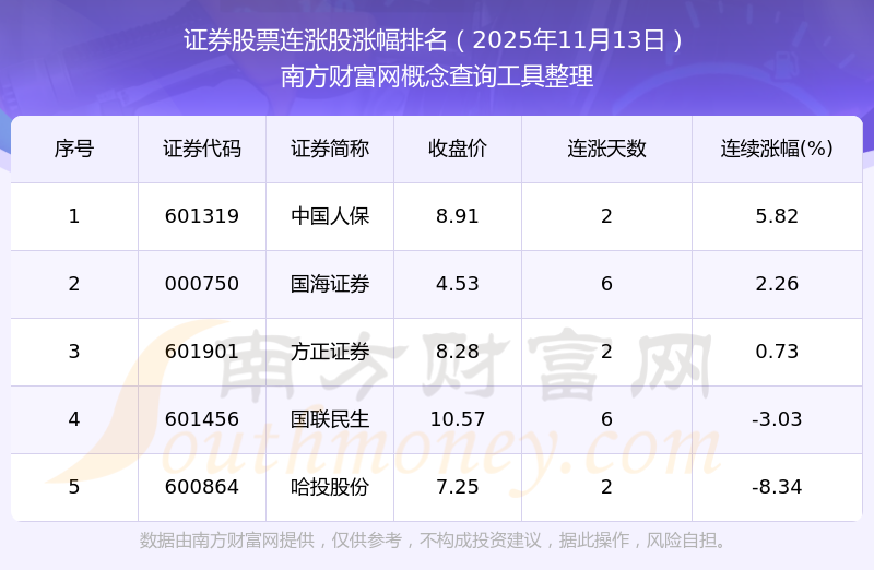 根據(jù)南方財富網(wǎng)概念查詢工具數(shù)據(jù)統(tǒng)計,截止2025年11月13日收盤,證券股票共有5只個股實現(xiàn)連漲。其中連續(xù)漲幅較大的個股有中國人保、國海證券、方正證券等,連續(xù)漲幅分別為5.82%、2.26%、0.73%。
