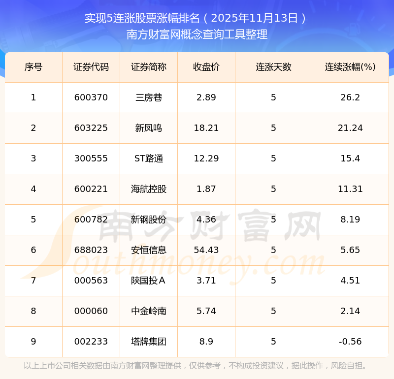 2025年11月13日實(shí)現(xiàn)5連漲股票漲幅排名