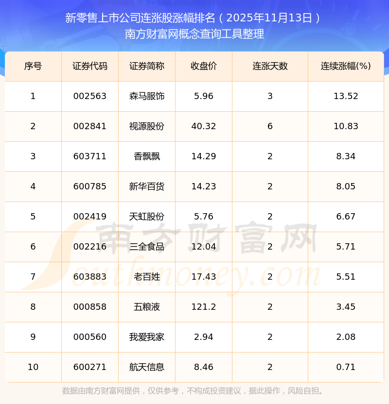 2025年11月13日新零售上市公司連漲股漲幅排名