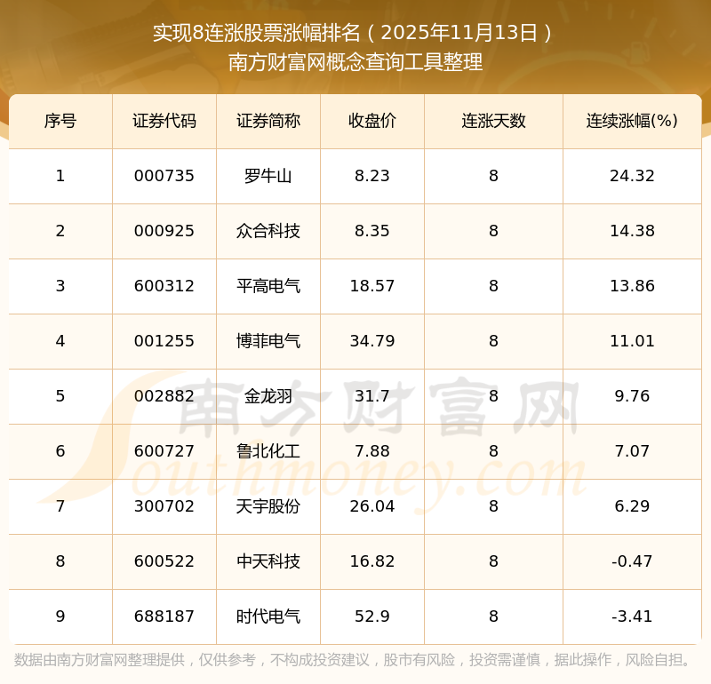 2025年11月13日實(shí)現(xiàn)8連漲股票漲幅排名