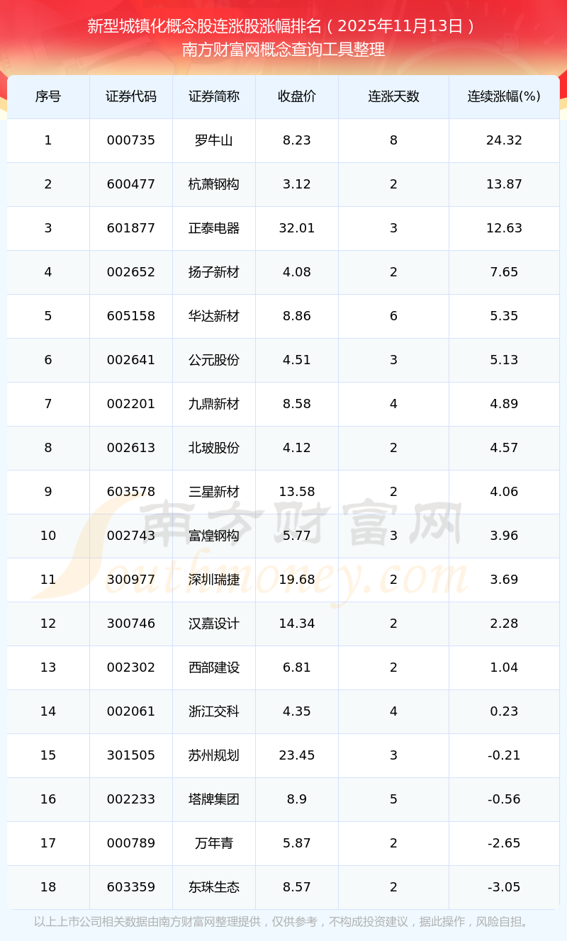 2025年11月13日新型城鎮(zhèn)化概念股連漲股漲幅排名