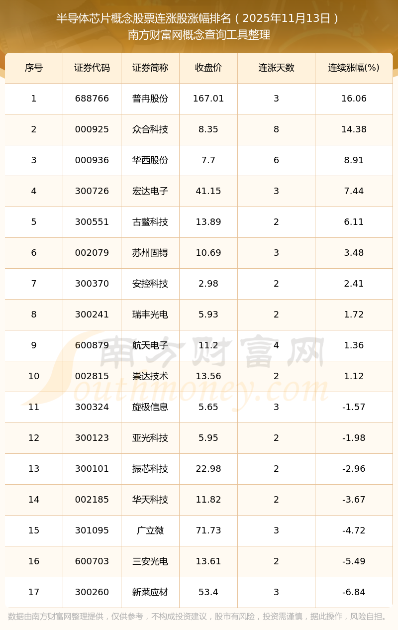 2025年11月13日半導(dǎo)體芯片概念股票連漲股漲幅排名