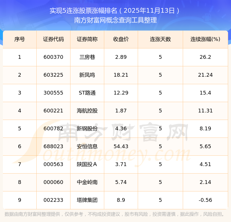 2025年11月13日實(shí)現(xiàn)5連漲股票漲幅排名