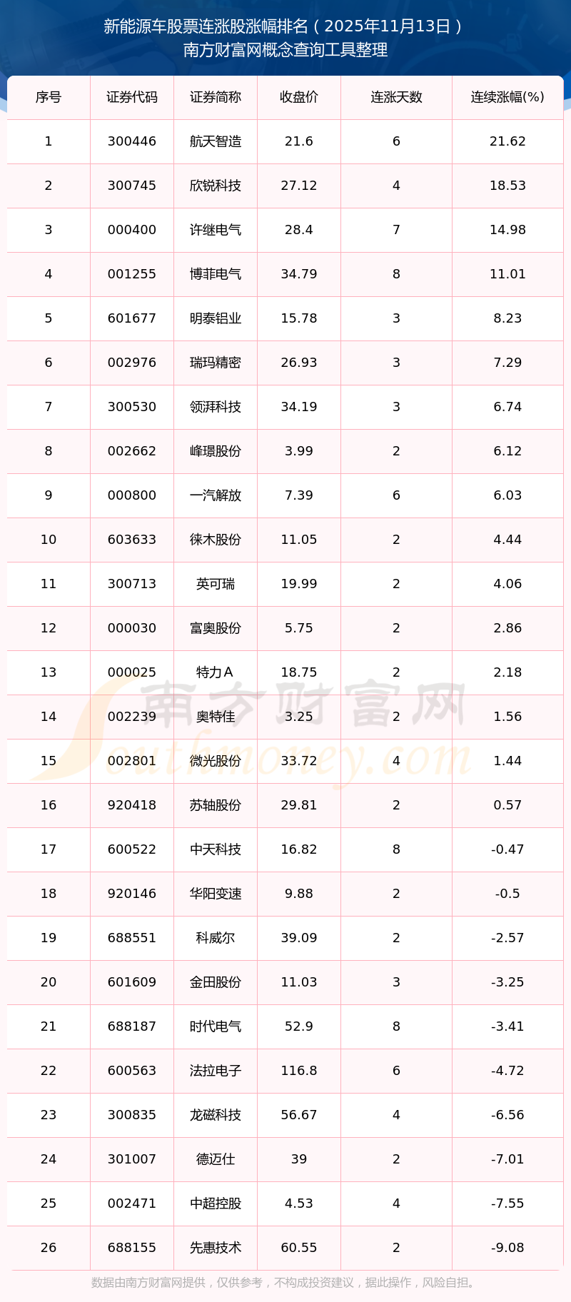 根據(jù)南方財(cái)富網(wǎng)概念查詢工具數(shù)據(jù)統(tǒng)計(jì),截止2025年11月13日收盤,新能源車股票共有26只個(gè)股實(shí)現(xiàn)連漲。其中連續(xù)漲幅較大的個(gè)股有航天智造、欣銳科技、許繼電氣等,連續(xù)漲幅分別為21.62%、18.53%、14.98%。