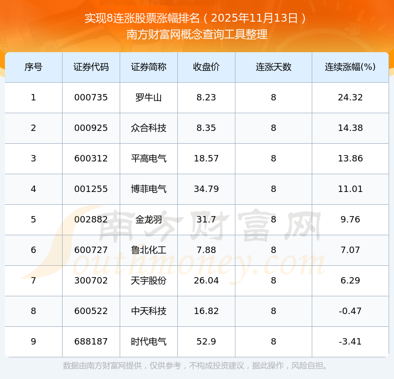 2025年11月13日實(shí)現(xiàn)8連漲股票漲幅排名