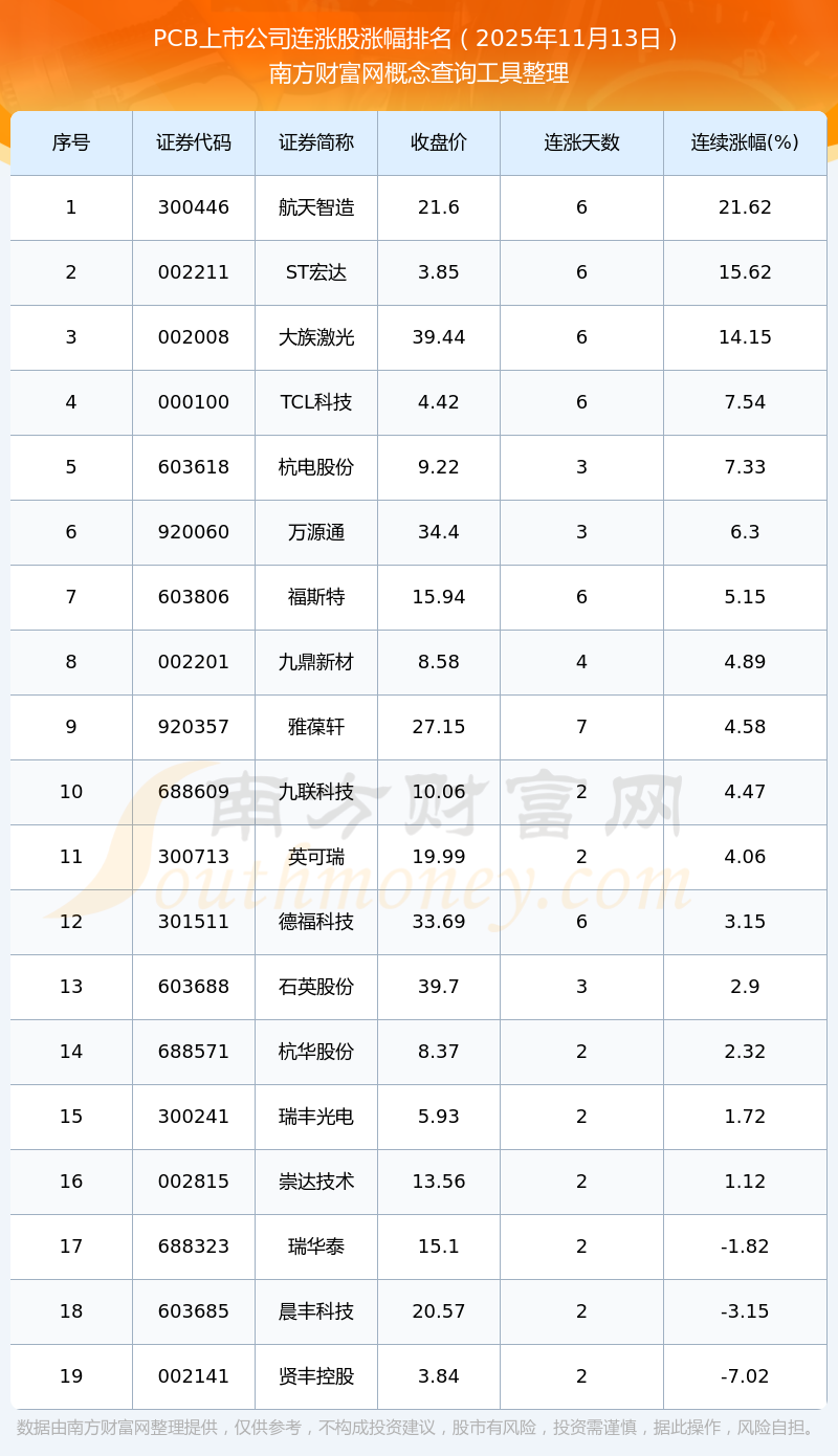 根據(jù)南方財富網(wǎng)概念查詢工具數(shù)據(jù)統(tǒng)計,截止2025年11月13日收盤,PCB上市公司共有19只個股實現(xiàn)連漲。其中連續(xù)漲幅較大的個股有航天智造、ST宏達、大族激光等,連續(xù)漲幅分別為21.62%、15.62%、14.15%。