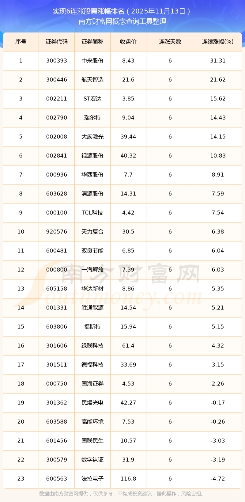 2025年11月13日實現(xiàn)6連漲股票漲幅排名