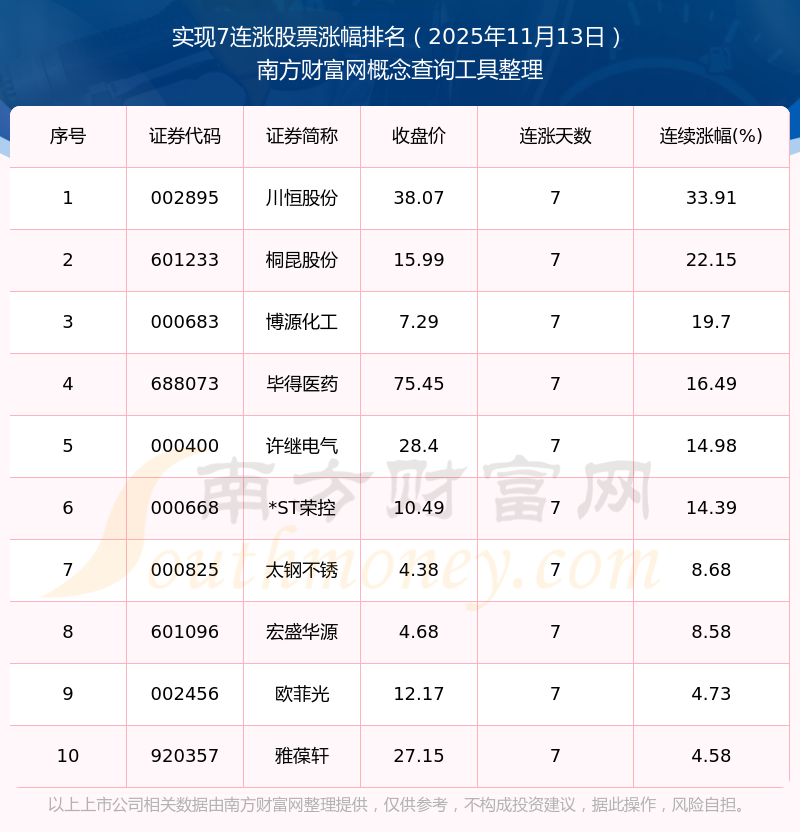 2025年11月13日實(shí)現(xiàn)7連漲股票漲幅排名