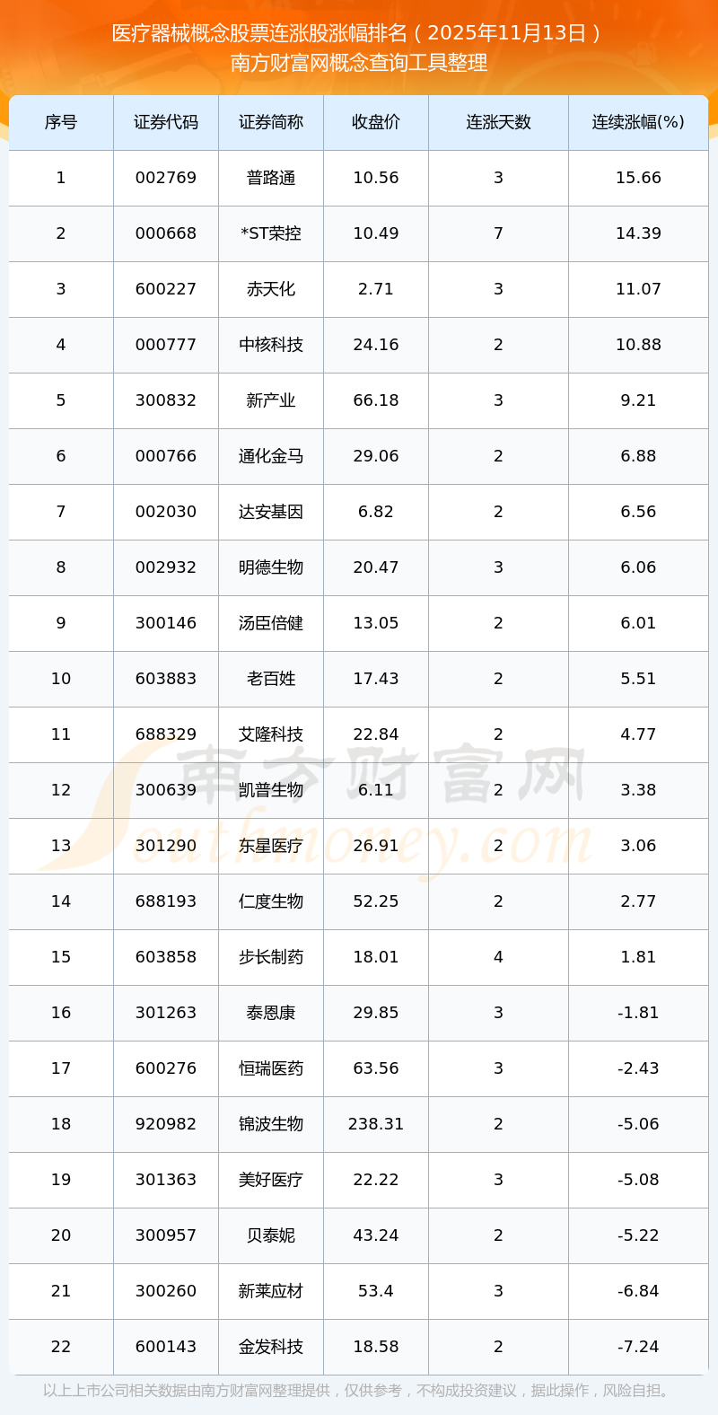 2025年11月13日醫(yī)療器械概念股票連漲股漲幅排名