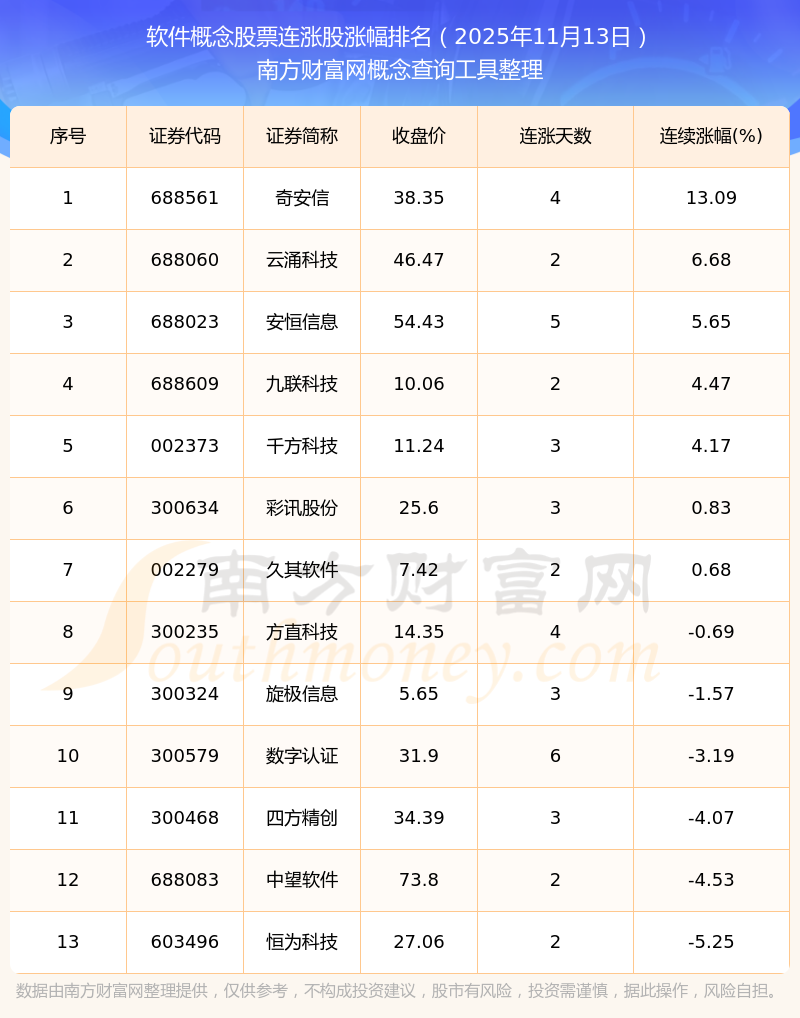 2025年11月13日軟件概念股票連漲股票漲幅排名