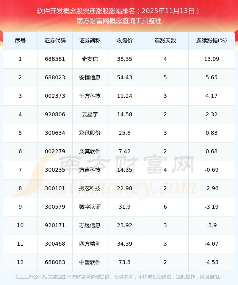 2025年11月13日軟件開(kāi)發(fā)概念股票連漲股漲幅排名