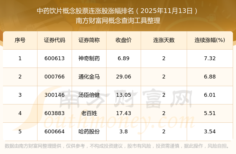 2025年11月13日中藥飲片概念股票連漲股漲幅排名