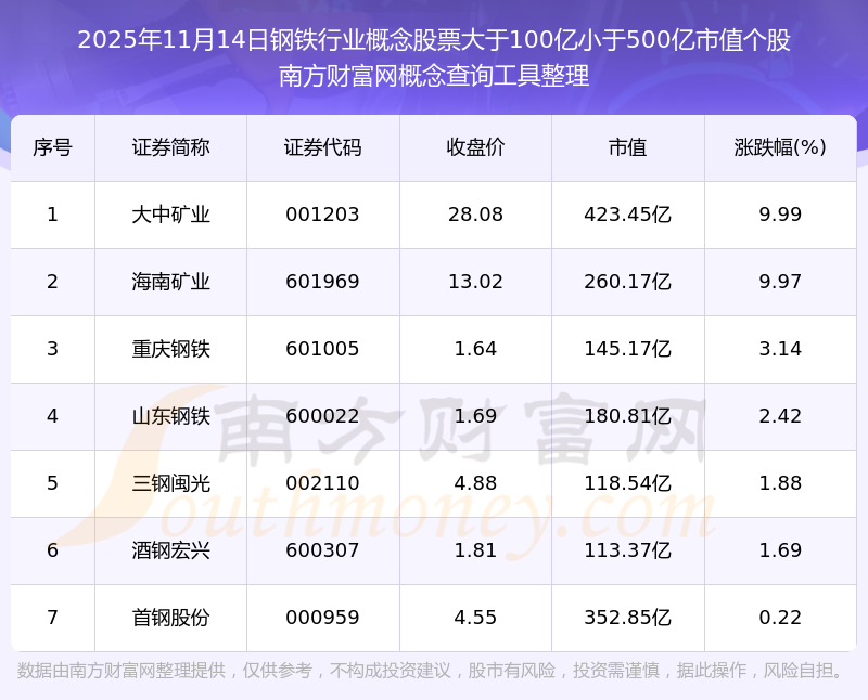 截止2025年11月14日,鋼鐵行業(yè)概念股票市值大于100億小于500億的個(gè)股共有7只。其中,市值較高的有大中礦業(yè)、首鋼股份、海南礦業(yè),市值分別為423.45億元、352.85億元、260.17億元。