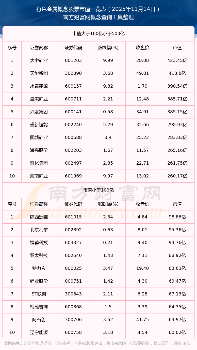 截止2025年11月14日,有色金屬概念股票中陜西黑貓、航民股份、怡球資源、鑫科材料、梅雁吉祥等24家市值位于不足100億之列;金鉬股份、潞安環(huán)能、昊華科技、白銀有色等57家市值位于100億到500億之列;巨化股份、中國中冶、云天化、東陽光、南山鋁業(yè)等8家市值位于500億到1000億之列;中煤能源、北方稀土、山東黃金、兗礦能源等7家市值位于1000億到2000億之列;陜西煤業(yè)和中國鋁業(yè)市值位于2000億到5000億之列;中國神華和紫金礦業(yè)市值位于5000億到10000億之列。