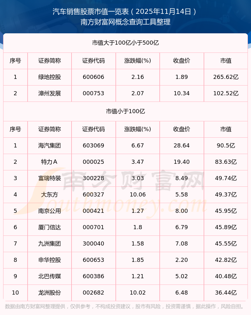 截止2025年11月14日,汽車銷售板塊股票中國(guó)機(jī)汽車、海汽集團(tuán)、新余國(guó)科等29家市值位于不足100億之列;格林美、一汽解放、錦浪科技等22家市值位于100億到500億之列;天齊鋰業(yè)、廣汽集團(tuán)、芒果超媒等3家市值位于500億到1000億之列;中國(guó)中鐵和長(zhǎng)安汽車市值位于1000億到2000億之列;比亞迪市值位于5000億到10000億之列。