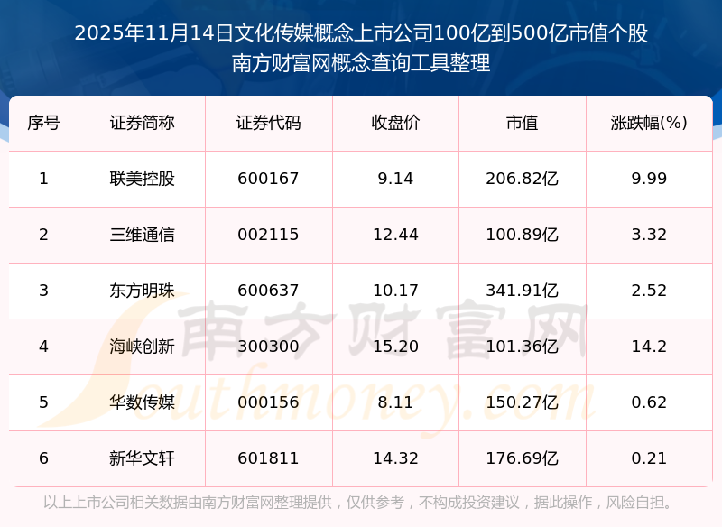 截止2025年11月14日,文化傳媒概念上市公司市值100億到500億的個股共有6只。其中,市值較高的有東方明珠、聯(lián)美控股、新華文軒,市值分別為341.91億元、206.82億元、176.69億元。
