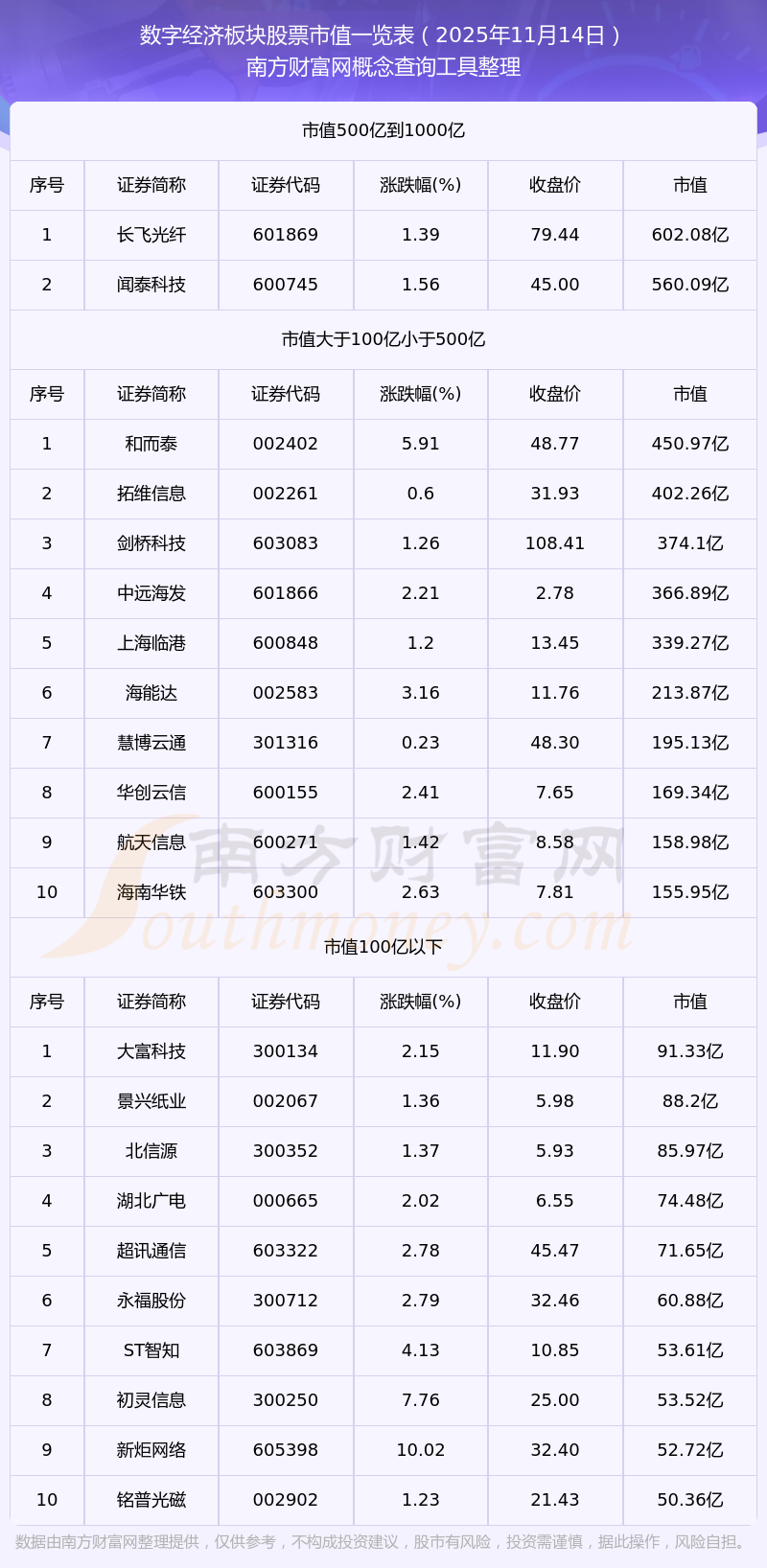 截止2025年11月14日,數(shù)字經(jīng)濟板塊股票中翠微股份、能科科技、掌閱科技等39家市值位于不足100億之列;用友網(wǎng)絡(luò)、士蘭微、四川長虹、中國軟件等39家市值位于100億到500億之列;三六零、川投能源、長電科技、寶信軟件、長飛光纖等9家市值位于500億到1000億之列;長城汽車、三一重工、中微公司、中國聯(lián)通、中科曙光等7家市值位于1000億到2000億之列;海光信息和海爾智家市值位于2000億到5000億之列;中國電信市值位于5000億到10000億之列;中國移動、工業(yè)富聯(lián)、中國平安等3家市值位于大于10000億之列。