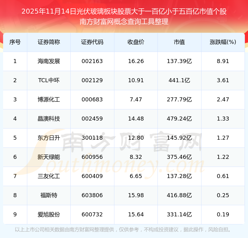 截止2025年11月14日,光伏玻璃板塊股票市值大于一百億小于五百億的個(gè)股共有9只。其中,市值較高的有晶澳科技、TCL中環(huán)、福斯特,市值分別為479.24億元、441.1億元、416.88億元。