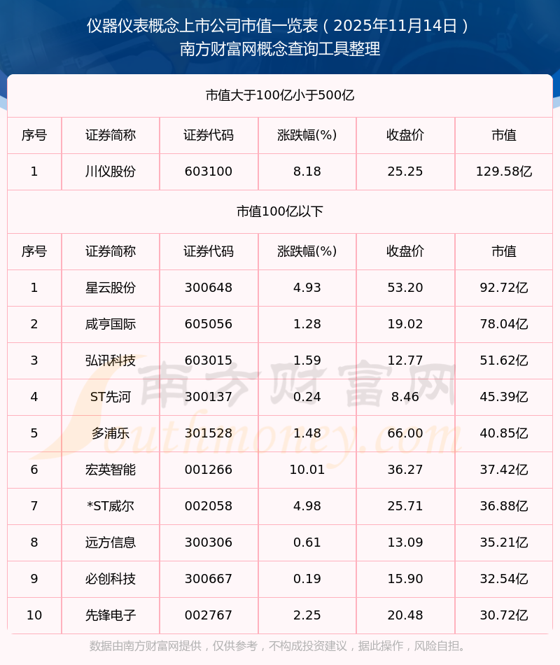 截止2025年11月14日,儀器儀表概念上市公司中麥克奧迪、禾信儀器、信捷電氣、炬華科技等80家市值位于不足100億之列;三星醫(yī)療、華測(cè)檢測(cè)、埃斯頓、柯力傳感等17家市值位于100億到500億之列;正泰電器和紫光國微市值位于500億到1000億之列;匯川技術(shù)市值位于1000億到2000億之列。