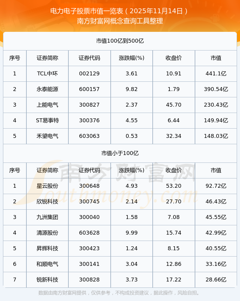 截止2025年11月14日,電力電子上市公司中能科科技、夢網(wǎng)科技、佳電股份、星云股份等32家市值位于不足100億之列;中國西電、TCL中環(huán)、均勝電子、麥格米特等29家市值位于100億到500億之列;東方電氣、三安光電、正泰電器、中天科技等4家市值位于500億到1000億之列;匯川技術(shù)、上汽集團、上海電氣、思源電氣等4家市值位于1000億到2000億之列;陽光電源市值位于2000億到5000億之列。