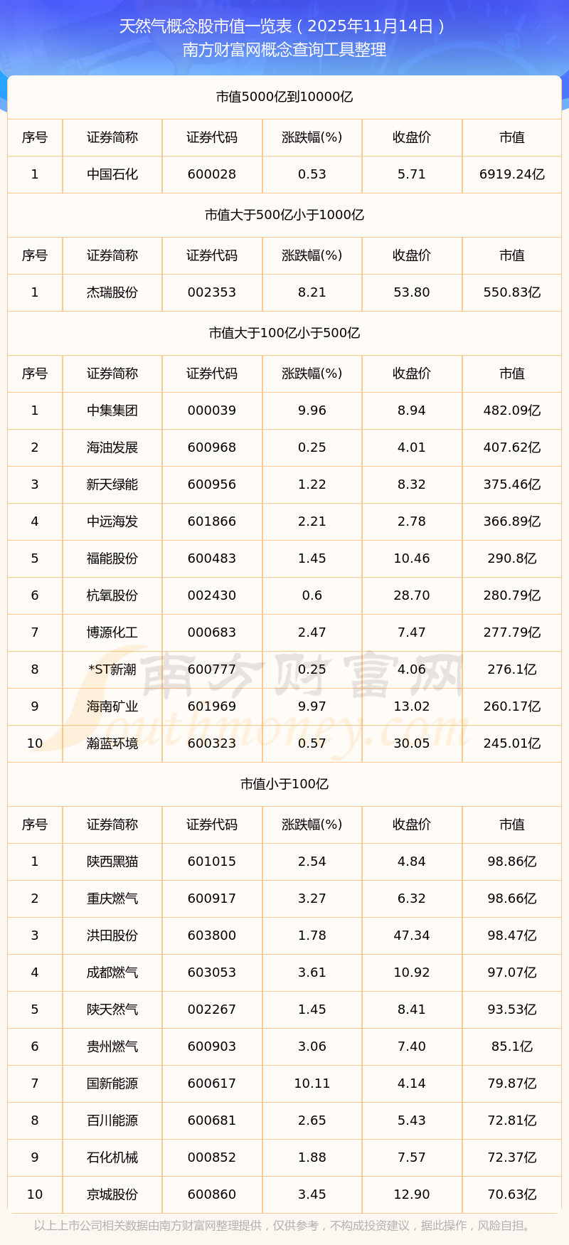 截止2025年11月14日,天然氣概念股中金宏氣體、陜西黑貓、重慶燃?xì)獾?9家市值位于不足100億之列;石化油服、中集集團(tuán)、申能股份、海油發(fā)展等41家市值位于100億到500億之列;上海電力、招商輪船、中遠(yuǎn)海能、中海油服等7家市值位于500億到1000億之列;中國(guó)石化市值位于5000億到10000億之列;中國(guó)石油和中國(guó)海油市值位于大于10000億之列。