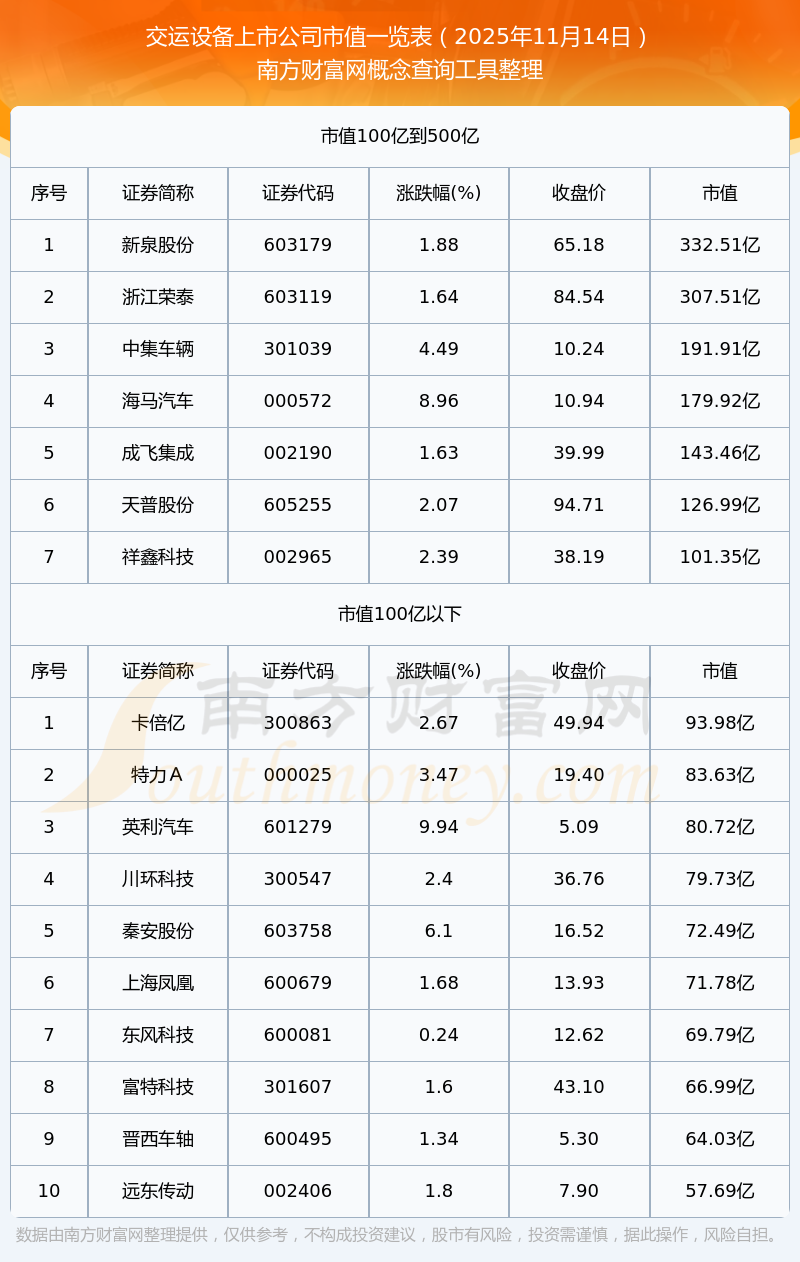 截止2025年11月14日,交運(yùn)設(shè)備上市公司中國(guó)機(jī)汽車、福達(dá)股份、動(dòng)力新科、今創(chuàng)集團(tuán)等59家市值位于不足100億之列;北汽藍(lán)谷、均勝電子、春風(fēng)動(dòng)力等28家市值位于100億到500億之列;廣汽集團(tuán)、宇通客車、華域汽車等5家市值位于500億到1000億之列;長(zhǎng)城汽車、上汽集團(tuán)、福耀玻璃、拓普集團(tuán)、江淮汽車等5家市值位于1000億到2000億之列;賽力斯和中國(guó)中車市值位于2000億到5000億之列。