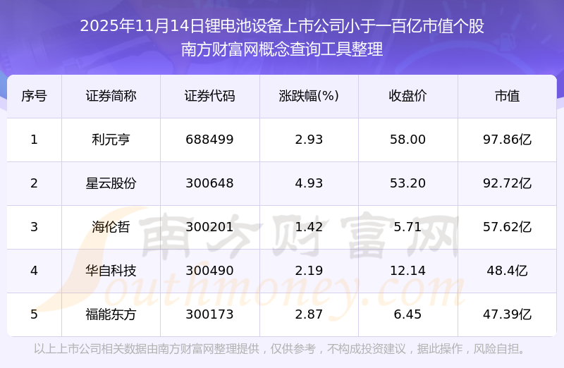 截止2025年11月14日,鋰電池設(shè)備上市公司市值小于一百億的個(gè)股共有5只。其中,市值較高的有利元亨、星云股份、海倫哲,市值分別為97.86億元、92.72億元、57.62億元。