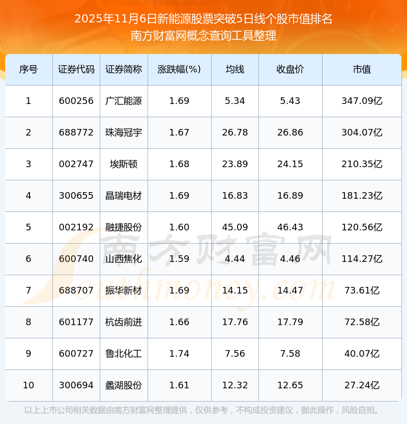 2025年11月6日新能源股票突破5日線個股市值排名