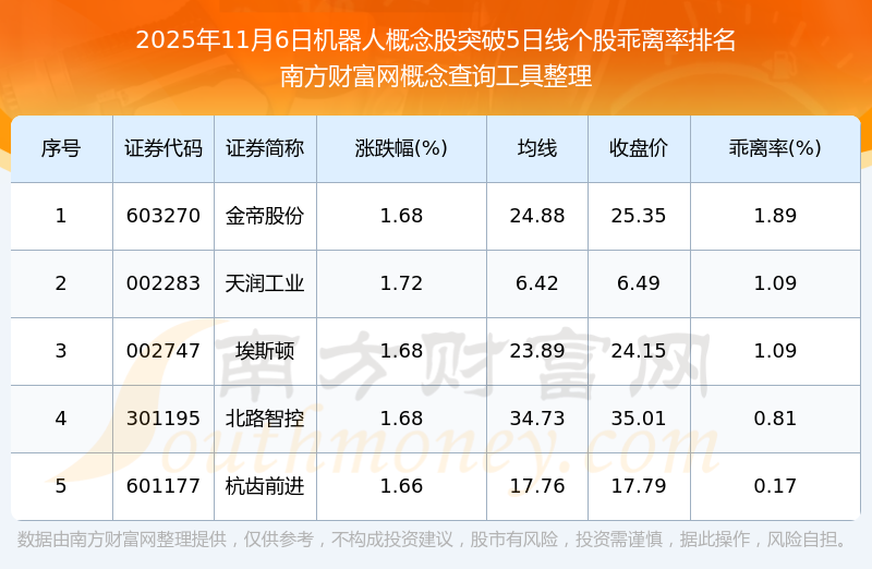 2025年11月6日機(jī)器人概念股突破5日線個(gè)股乖離率排名