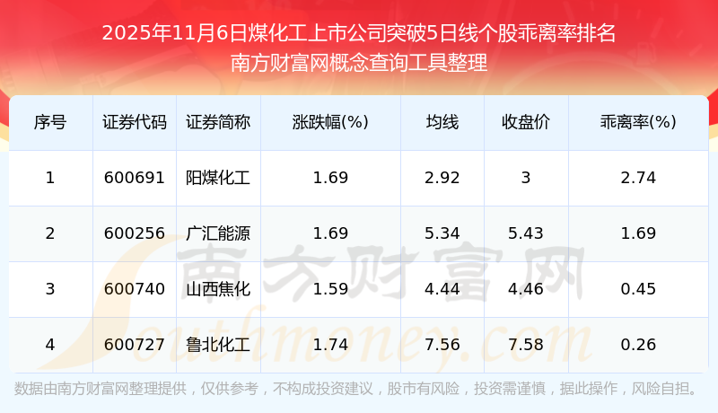 2025年11月6日煤化工上市公司突破5日線個(gè)股乖離率排名