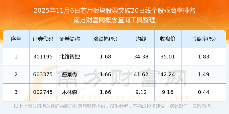 2025年11月6日芯片板塊股票突破20日線個(gè)股乖離率排名