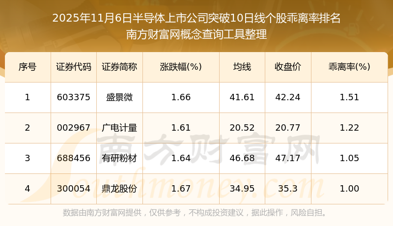 2025年11月6日半導(dǎo)體上市公司突破10日線個股乖離率排名