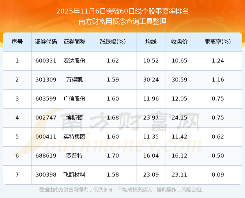 根據南方財富網概念查詢工具數據統(tǒng)計,截止2025年11月6日收盤,共有7只個股收盤價向上突破了60日線,其中乖離率較大的個股有宏達股份、萬得凱、廣信股份、埃斯頓、英特集團等,乖離率分別為1.24%、1.16%、0.75%、0.75%、0.62%。