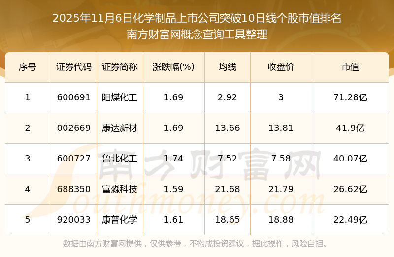 2025年11月6日化學(xué)制品上市公司突破10日線個(gè)股市值排名