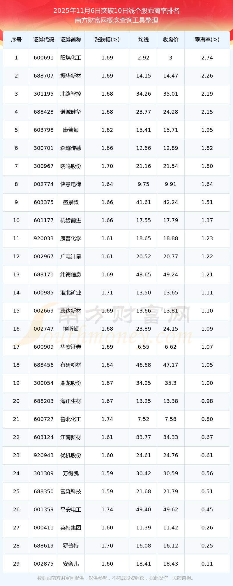 2025年11月6日突破10日線個(gè)股乖離率排名