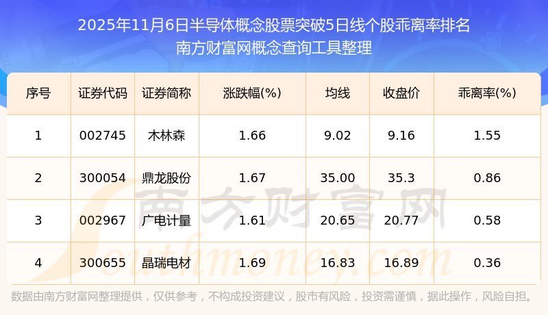2025年11月6日半導(dǎo)體概念股票突破5日線個(gè)股乖離率排名