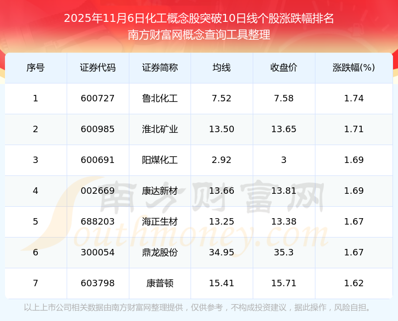 根據(jù)南方財(cái)富網(wǎng)概念查詢工具數(shù)據(jù)統(tǒng)計(jì),截止2025年11月6日收盤,化工概念股共有7只個(gè)股收盤價(jià)向上突破了10日線。其中漲幅較大的個(gè)股有魯北化工、淮北礦業(yè)、陽(yáng)煤化工等,漲幅分別為1.74%、1.71%、1.69%。