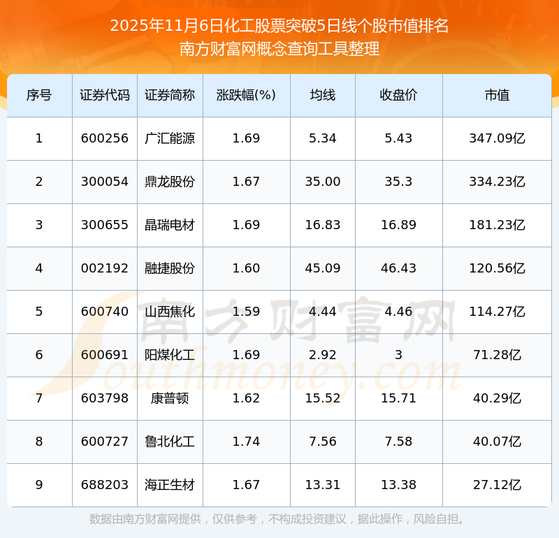 2025年11月6日化工股票突破5日線個(gè)股市值排名