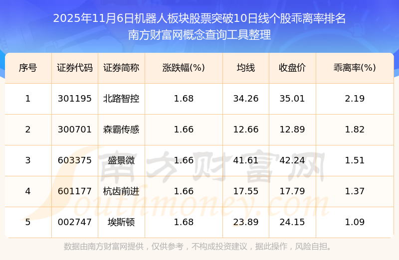 根據(jù)南方財(cái)富網(wǎng)概念查詢工具數(shù)據(jù)統(tǒng)計(jì),截止2025年11月6日收盤,機(jī)器人板塊股票共有5只個(gè)股收盤價(jià)向上突破了10日線。其中乖離率較大的個(gè)股有北路智控、森霸傳感、盛景微等,乖離率分別為2.19%、1.82%、1.51%。